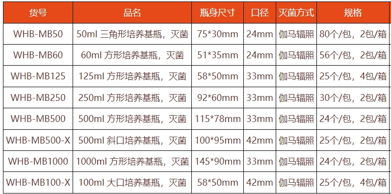 规格有50ml、60ml、125ml、250ml、500ml、500ml斜口、1000ml、100ml大口;